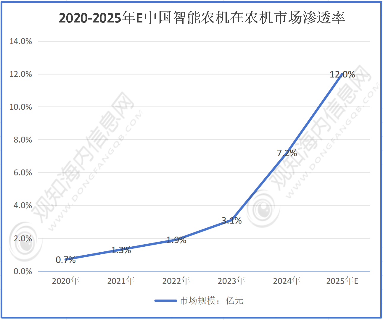 按照数据显示:2020年渗入率0。7%,2022年1。9%,2023年3。1%,2024年7。2%,2025年估计12。0%。全体呈现上升趋向,智能农机正在农机市场的渗入程度不竭加深,行业成长态势优良。