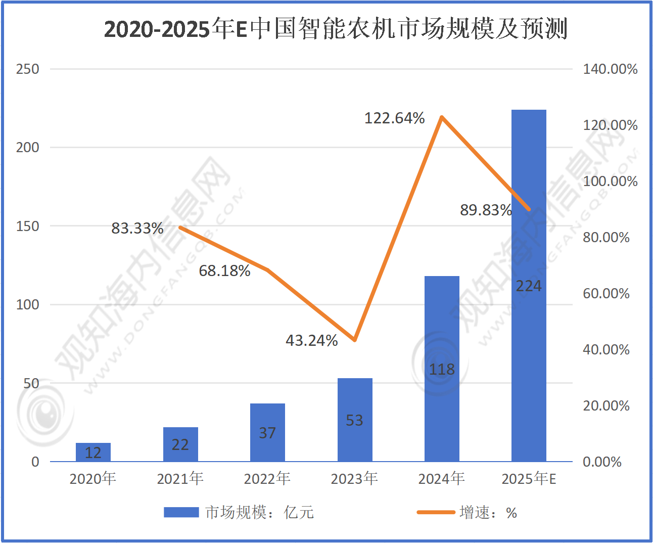 智能农机行业是指将现代消息手艺、从动化手艺取农业机械手艺相连系,实现农业出产过程智能化办理取操做的行业。智能农机凡是配备传感器、节制系统、做物形态和功课需求,并按照预设法式或及时反馈进行精准操做。跟着农业劳动力的削减和劳动力成本的上升,农业出产对提高效率、降低人力成本的需求日益火急。智能农机可以或许实现从动化、精准化功课,大幅提高农业出产效率,降低人力成本,同时还能优化资本操纵,提拔农做物产量和质量,满脚了市场对农业出产现代化的需求。按照数据显示:2020年市场规模12亿元,2021年22亿元,2022年37亿元,2023年53亿元,2024年118亿元,2025年估计224亿元。全体呈现增加趋向,行业成长态势优良。
