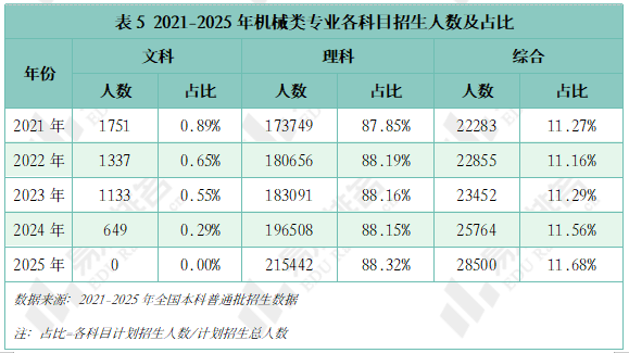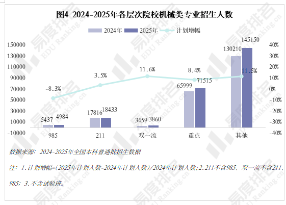 机械类专业被誉为“工科之母”,正在上世纪鼎力奉行机械化时红极一时,后期陷入长达几十年的缄默期。风水轮番转,跟着新能源汽车、机械人财产成为新的风口,机械类专业的春天似乎回来了?机械类专业点新增数量自2020年持续下滑,正在2023年触底后回升,2024年新增104个专业点。五年新增专业点总数前三名别离是智能制制工程(241个)、新能源汽车工程(92个)、智能车辆工程(60个),人工智能、新能源汽车的高速成长催生大量相关专业。机械类专业招生打算人数逐年添加,打算占比连结正在5%以上,同专业类年增数量一样,正在2023年触底反弹。乘着机械人、新能源财产的春风,机械类专业正正在进行跨专业转型,已经的“工科之母”正在多年冷掉队热度回升。做为专业类中的“老迈哥”,机械设想制制及其从动化专业正在整个专业类的占比增速变缓,智能制制、新能源等新兴专业则连结较快增速,别离由2021年的5。4%、0。7%升至2025年的12。7%、4。0%。农林智能配备工程、智能交互设想、智能车辆工程、机械工艺手艺排名前四,均上涨45%以上,汽车办事工程、微机电系统工程、机电手艺教育等专业本年大幅缩减。专业迭代紧跟行业变化,从动化、智能化的新兴专业将逐渐替代保守专业。取专业点新增数量一样,机械类专业招生院校数量也履历了先削减后添加的过程,且拐点先于专业点呈现,于2022年降至687所后逐年添加,2025年共有706所院校招收该专业类。但其增速不及全国本科招生院校总数增加速度,院校占比尚未回到2021年程度。985院校机械类招生人数波动式下降,本年达到五年来最低,较2024年缩减8。3%,其他各条理院校则有3%-12%的涨幅,以更大的体量支持机械类招生总规模的抬升。近年,985院校缩减机械类专业招生规模已是常态,2021-2023年“三连降”,2024年急速回升,本年又起头下滑,华中科技大学、大连理工大学较客岁降幅达28%、23%。虽说机械类专业有所回温,但并非大热专业,尚处于新老专业更替期间,保守专业仍是招生从力,这就导致部门院校正在招生策略调整时将更多比例投放至市场需求度更高的专业,以“机械五虎”之一华中科技大学为例,2025年机械类招生打算较上一年降幅高居各专业类第一,电子消息类专业则扩招最多。近五年机械类专业招收文科\汗青考生的打算数逐年递减,至2025年完全归零,理科、分析科目标招生人数趋于不变,可知本年招生打算削减的部门多来自文科\汗青科目。机械类专业登科分数较着上涨,上涨专业占比约64%,下降专业占比仅25%。且下降幅度远不及上涨幅度,22%的专业上涨跨越5分,而下降跨越5分的专业仅有5%,且集中正在较低条理院校。985、211等高条理院校近五年登科位次走势并未呈现较着集体倾向,各校波动非常值较少,全体不变。以省为例,选择招生打算波动较小的六所高校进行展现,能够看出各校登科位次均未呈现大的波动,当然,各校环境有所分歧,中国海洋大学小幅上涨,华北电力大学()、姑苏大学极其平稳,中国矿业大学和长安大学正在缩招的环境下位次仍然呈现下滑。正在全国本科平均就业率逐年下降的大趋向下,机械类专业就业率逐年上涨,自2020年起头就业劣势较着回升,对于机械类专业来说,多年的寂静已被打破,行业规模基数复杂、财产升级需求强劲、政策支撑强化劣势,多方利好催化机械类专业焕发新的朝气。本科结业半年月收入一直高于全国本科平均程度,且薪资劣势逐年扩大,结业五年后取平均薪资的差距进一步拉大,但上涨空间较为无限。跟着财产手艺迭代加快和职业布局调整,保守制制业中“车间师傅越老越吃喷鼻”的胡想早已破灭,无论是薪酬增加仍是职位晋升,顺应行业变化、及时更新本身能力模子才是第一鞭策力。机械类专业结业五年就业对劲度差强人意,2020-2021年较平均值低5%摆布,2022年起头逃逐,但一直处于正在平均线及以下。机械类专业虽起薪较高,但持久成长需面对就业地区差别大、职业成长天花板较着、行业转型压力加剧的问题。财产集聚区成长空间大,但地区笼盖面窄,手艺门槛大幅提拔,从业者持续进修方能应对,且智能制制本身就是躲藏正在从业者背后的一种替代性危机。