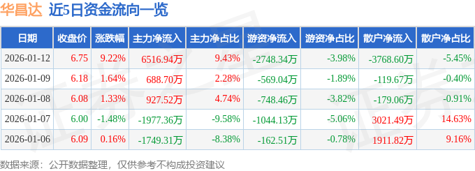 证券之星动静,截至2026年1月12日收盘,华昌达(300278)报收于6。75元,上涨9。22%,成交量105。84万手,成交额6。91亿元。1月12日的资金流向数据方面,从力资金净流入6516。94万元,占总成交额9。43%,逛资资金净流出2748。34万元,散户资金净流出3768。6万元,占总成交额5。45%。